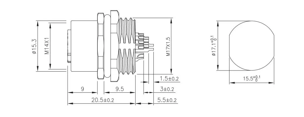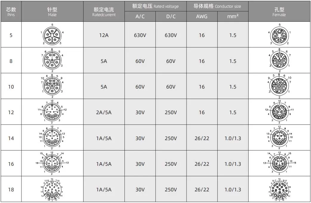 Conector estándar europeo serie M14 Tipo de estructura: enchufe de montaje frontal Tipo de clavija: tipo hembra Número de contactos: 2,3,4,5,8,12,14,19 pines Método de conexión: soldadura Blindaje: No Certificación: CE,ROHS,UL, Estándar: IEC 61076-2-101