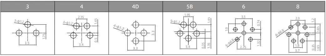 Conectores estándar europeos Serie M8, Tipo de estructura: Zócalo de montaje frontal, Método de conexión: PCB, Tipo de pin: Macho, Número de contactos: 3,4,5,6,8 pines, Escudo: No, Certificación: CE, RoHS, UL, Estándar :IEC 61076-2-104,